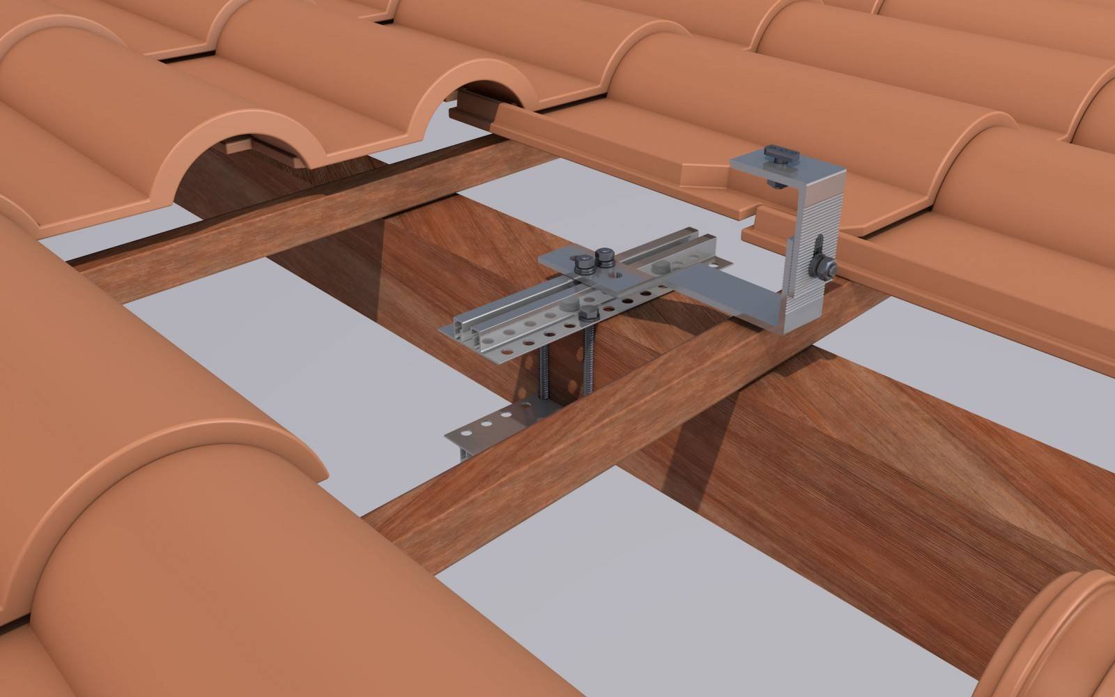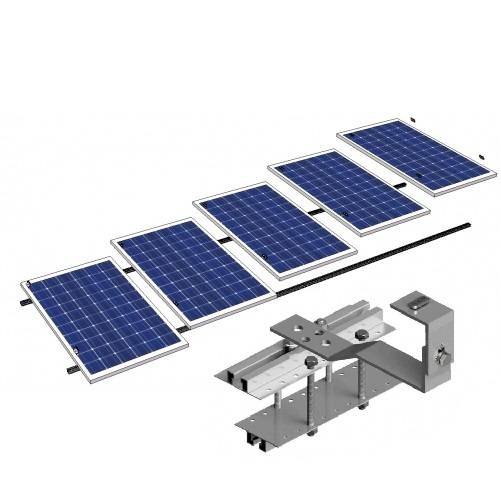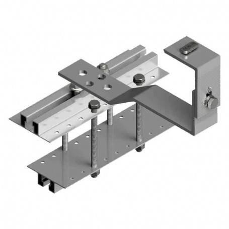 Suporte de painéis para telhado com salva-telhas e com abraçadeiras em viga